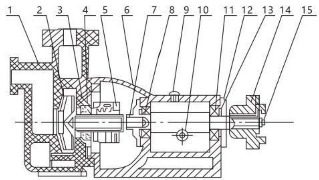 | 1 Badan Pompa | 2 Impeller | 3 Penutup Belakang | 4 Kelenjar | 5 Komponen Penyegel | 6 Braket | 7 Poros Pompa | 8 Bantalan |