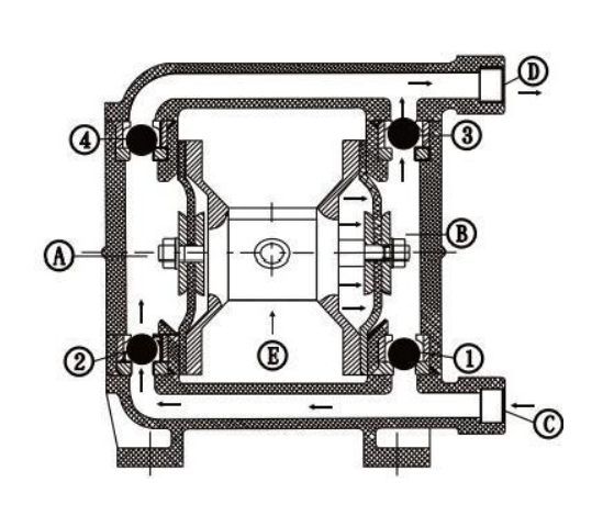 3. Dengan menekan secara bersamaan, bagian B menggunakan katup bola ③ untuk memaksa cairan keluar melalui saluran keluar ①; katup ① menutup untuk menghentikan aliran balik.