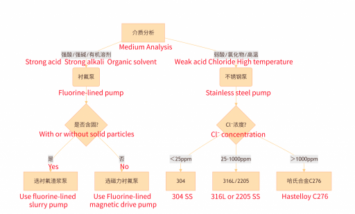 **Konsentrasi tinggi atau suhu tinggi**: Pompa sentrifugal paduan fluorin FSB atau pompa penggerak magnetik CQB direkomendasikan.